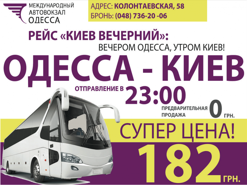 Уважаемые пассажиры, рады сообщить о новом рейсе "Киев Вечерний" следующий по маршруту: Измаил - Одесса - Киев - Чернигов (через Любашевку и Умань), который начинает свою работу с 11-го сентября и осуществляет рейсы по нечетным числам.
