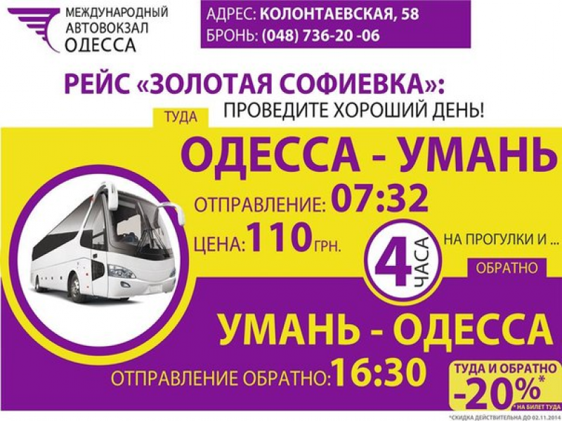 Международный Автовокзал Одесса запустил новый рейс "Золотая Софиевка": Одесса - Умань - Одесса.